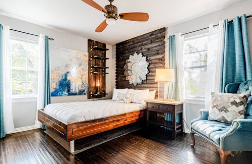 When travelling to Austin, it’s only right that you stay in a home filled with character, charm, and creativity to match this one-of-a-kind city. Mr. Wilson is a perfect homebase for your adventures in Austin with style that will delight guests, luxurious details for absolute relaxation, and outdoor spaces to enjoy for all occasions. Upstairs bedrooms have easy access to the 2nd story balcony overlooking the manicured front lawn and neighborhood beyond, while the lush backyard features outdoor dining under classic string lighting, a sturdy bar built from reclaimed wood, and a cozy outdoor sectional.