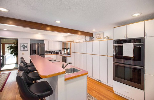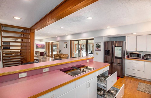 Unwind in this serene, chic 4-bedroom, 2.5-bath retreat. Features include a hot tub, exercise equipment, smart TV with games, ample natural light, and well water with advanced filtration. Outdoor and indoor spaces abound, along with a fully-equipped kitchen, fast WiFi, and a scenic work desk. Revel in the unique blend of comfort and nature.