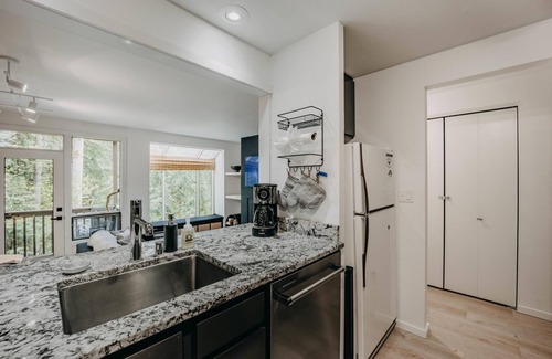 Snowater Condo #64 - Welcome to Pet-Friendly Camp Kulshan! Your family will have a delightful time staying in this recently remodeled 1-story, 1-bedroom, 1-bath condo. Upon entering, you’ll discover new plank flooring and new paint throughout, a more than ample ski and gear storage area, a nicely appointed bedroom with one queen-sized bed and plenty of closet space, one full bath including a new countertop and wash basin, a laundry cubby with a stack washer and dryer for cleansing your duds, a fully equipped galley style kitchen completes with a new higher-end dishwasher, range/oven, built-in microwave, and new countertops. There’s a convenient pass-through into the living/dining area for easy distribution of your culinary delights, along with a dining area that includes a table and seating for 4-persons. The living area includes a comfy full-sized hide-a-bed, a wood-burning fireplace insert (firewood not provided) to cozy up to, a flat-screen monitor for your viewing pleasure, a sitting nook, and a balcony offering a treed territorial view. This pet-friendly (2-pet maximum, no exceptions) and monitored family vacation property will comfortably sleep 2 to 4-persons (ENFORCED Maximum Occupancy!).