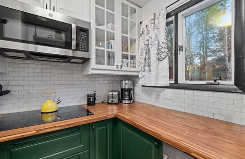 The cozy kitchen provides spacious counters and modern appliances for easy meal prep. Whip up tasty dinners, quick snacks, or steamy mugs of cocoa. Serve meals through the handy hatch (which also makes clean-up a breeze!). Note that I don’t have an oven.