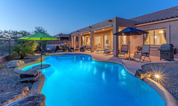 Our spacious and newly remodeled, 4 BR, 2 BA home, DESERET SUNSET, is located in a gated and upscale community. You'll love the backyard with its resort style amenities. A covered patio with dining furniture and comfortable seating choices overlooks the pool with optional heat. The pool heating fee is $75.00 per day to heat the pool to 80º F. A built in umbrella table and benches allow you to sit in the water and stay cool on our warmest days.
