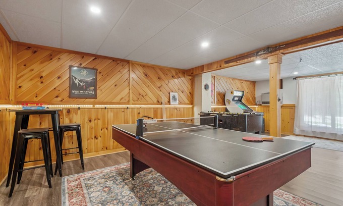 After a day of exploration, unwind at the pool or relax inside your cozy mountain retreat. The main floor features a spacious sectional couch and a flat-screen TV, perfect for family movie nights. Head to the finished basement game room, where fun awaits with a Golden Tee arcade game, pool table, ping pong, foosball table, and an additional family room with comfy couches and another flat-screen TV.