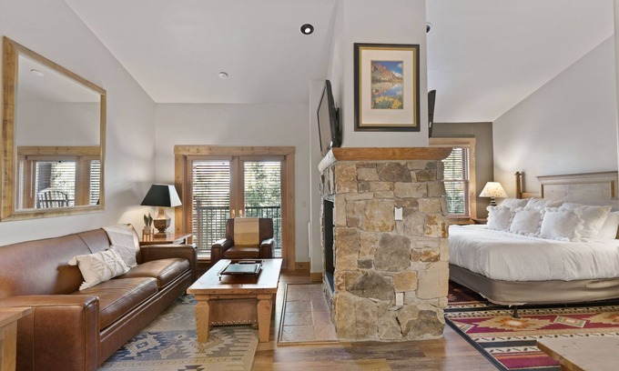 Ski IN, Ski OUT, Soak, Sip and repeat! The Mountain Lodge offers stunning views at every turn and enough amenities, services and charm to have you well taken care of when you're off the mountain! This deluxe studio features warm design, a personal patio, a cozy fireplace, a flat screen TV, deluxe kitchenette (just no oven) with new appliances, new wood floors, ample storage space and a full rotation of resort-style services! There is a King bed speedster from the living room by a stone fireplace. The living area has a queen sleeper sofa if needed. The Mountain Lodge Retreat is outfitted with a premium Nespresso machine, premium coffee, teas, snacks and sparkling waters.