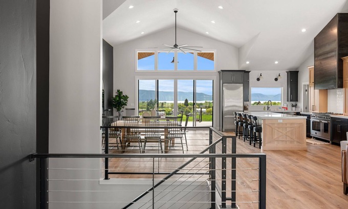 Welcome to Mountain Shadow Lodge North. This brand new beautifully furnished home with over 4000 square feet has 6 gorgeously decorated bedrooms and 7 bathrooms. Enjoy having breakfast on the large patio overlooking the lake. An indoor swimming pool and hot tub with replicated majestic rock formations found in Logan Canyon. Start your day with a workout in our exercise room overlooking beautiful Bear Lake, where you will find treadmills, bikes, and plenty of resistance equipment. Gather around the magnificent fireplace in the evenings or watch a movie in the spacious downstairs family room equipped with a theater screen and projector, including a wet bar area to keep you favorite treats.
