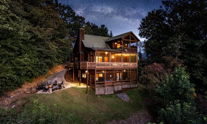 PERFECT FOR LARGE OR MULTIPLE FAMILIES! Nestled on a hillside overlooking beautiful downtown Blue Ridge, our cabin offers long range, panoramic views of the picturesque North Georgia mountains. Our spacious cabin offers three levels of fully screened decks to entertain BUG FREE! Located in the Aska adventure area, and only a short three mile drive to all the dining and shopping options in downtown Blue Ridge. The road leading to the cabin is paved so no need for an SUV!