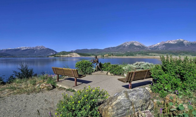 Discover Dillon from this 2-bed, 2-bath vacation rental situated on the waterfront of Lake Dillon. Complete with rustic mountain decor, a wood-burning fireplace, and views of the snow-capped Rockies, this ground floor condo is the ideal place to recharge after outdoor adventures. Take advantage of the fresh powder at the many world-class ski resorts in Summit County, or explore miles of scenic biking trails steps from your door! End your days unwinding in the indoor community hot tub and pool.