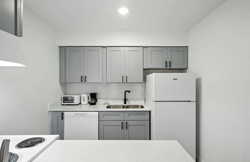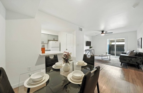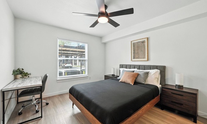 Stylish, fully furnished apartment in Austin’s Mueller neighborhood. Features include quartz countertops, modern lighting, sleek hardware, and plenty of natural light. Enjoy a spacious layout with a comfy living area, fully equipped kitchen, and in-unit washer/dryer. Designed for comfort and convenience—perfect for short or long stays!