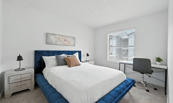 Stylish, fully furnished apartment in Austin’s Mueller neighborhood. Features include quartz countertops, modern lighting, sleek hardware, and plenty of natural light. Enjoy a spacious layout with a comfy living area, fully equipped kitchen, and in-unit washer/dryer. Designed for comfort and convenience—perfect for short or long stays!