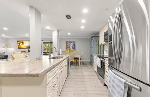 The GRANITE KITCHEN has a central island with a fridge, stove, oven, and dishwasher. Perfect for cooking vacation size meals and right next to the Dining and Living room.
