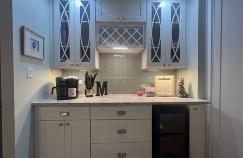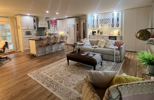 This 1969 Ranch style home is a home away from home you won’t want to miss. Everything about it is completely brand new while keeping it’s vintage 70’s feel. This newly renovated and professionally decorated home could not get any better. The fun wallpaper and colors are a delightful change you just must experience for yourself. With the perfect outside area including a hot tub, firepit, lounging set, screened in back porch, outside bar, activity center with a ping-pong table, human chess, or checkers, and spacious fenced in backyard. There is something for any and everyone. Inside there is an open layout intended for quality time with your loved ones. There are 3 queen size bedrooms and one full size bedroom. All bedrooms include a relaxing ambiance. The living room has a spacious and comfy couch that could happily be slept on if needing extra space for sleeping arrangements. There are 2 full bathrooms and a half bath. The pink peacock bathroom has a double sink and shower that could be used as a bath or shower. The spa bath has a standing glass shower and a freestanding tub, a spa scene in your own vrbo. The powder bath has a vintage sunshine feel with original tile. The kitchen has a spacious island to seat four people and a dining table with four seats as well. The kitchen is stocked with spices and cooking utensils, should you desire a home cooked meal. Although I would take advantage of the multitude of great restaurants Columbia offers.