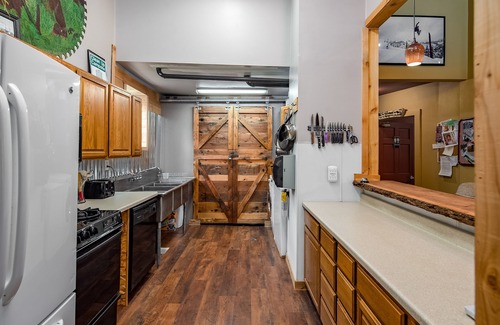 The kitchen features a fridge, gas stove, three bin commercial sink, dish washer, washer and dryer and is fully stocked with all the essentials.