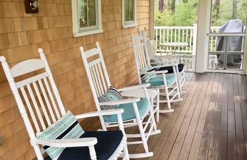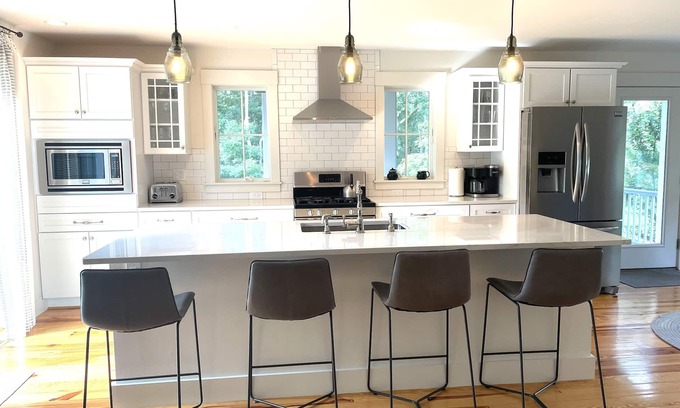 The main floor includes a spacious, fully equipped, kitchen with a large island, stainless steel appliances and Quartz counters. The kitchen is open to the dining room, which has a large table with seating for 10 (plus 4 additional stools at the kitchen island). Off the kitchen is a large screened-in porch as well as a patio with a gas grill. The screened porch has two ceiling fans for added comfort and 4 porch rockers. There is a picnic table in the back yard that comfortably seats 10.