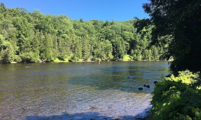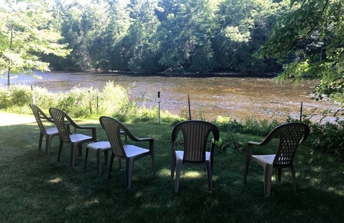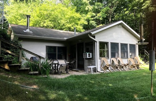 The Cabin at the River offers a serene location, great fishing, and kayaking, very close to the public boat launch, and the Cabin can accommodate boat parking. With 20 acres of woods and Michigan Prairie, there is wildlife to observe and trails to hike. But life at the Cabin revolves around one thing: the river. Just a few steps down gives easy access for your fly-fishing adventures for brown and rainbow trout, steelhead and coho salmon. Let the kids explore and find the crayfish. Put your kayak in right from your Cabin, or rent a canoe, kayak, or tube just up the road at Croton Dam and paddle or float by your Cabin to the High Rollaway for easy pick-up. When you aren't on or in the river, you will probably be listening to it or watching it from the Cabin. There is always something happening: Great Blue Herons fly low and strong up and down river twice a day, while Bald Eagles soar above, and kingfishers dive. Flotillas of families float by and wave while you watch from the lawn chairs. Watch the fishermen and women pull out a big one! When the sun sets, grill a steak out on the patio, or build a fire in the outdoor fire pit and toast marshmallows. There is a half flight of stairs to access the Cabin from the parking area. Inside, watch TV if you must (from the two leather Lazy Boys), or pull out a game or a book or a puzzle. You will have a fully stocked kitchen, as this is a home, not just a rental property! Sleeping will be comfortable, whether you snooze in the king bed on the sleeping porch bedroom, or in one of the two twin beds in the rear bedroom, or on the queen sleeper in the living room. The Cabin demands a slower pace than at home, but it is not isolated. Casual restaurants are close, as are great hiking trails, and if you want a longer field trip, Lake Michigan beaches beckon just an hour west, or the best mid size city in the Midwest is just 45 minutes south. But you will probably want to stay and play games on the lawn or see if a walk in the woods, on the marked trails will yield a sighting of the deer, porcupine, or wild turkeys. Relax. You are on Cabin time.