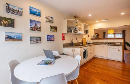The house is older with some quirks, so this is a great budget option for those wanting to stay with lots of guests and their pets in a great central location. It has an open plan Kitchen / Dining / Living area with three double rooms and a bunk room. Heating is provided by a heat pump in the lounge and sleep out plus a gas fire in the living room