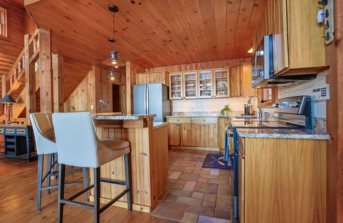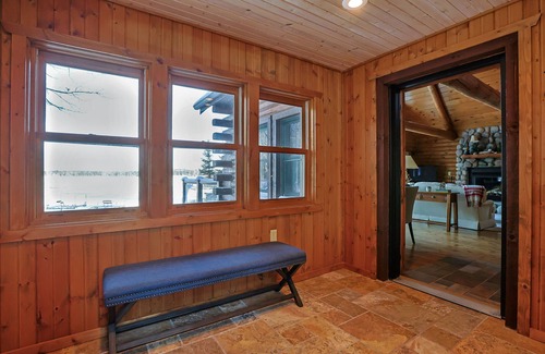 Upon entering Rest Lake Retreat through the oversized mudroom, you will see high ceilings that showcase authentic log beams and a wall of windows facing the lake. In this main living area, there is a dining space, living room with a wood burning fireplace, and a kitchen with extra seating around the island. There are also two bedrooms and a full bathroom just down the hallway past the kitchen.