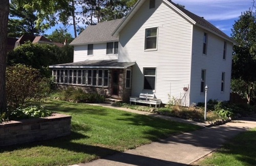This historic home on the west side of the Village of Elk Rapids! Prime location just two blocks from gorgeous sandy beach, playground, shops, restaurants, movie theater, and more! The spacious main floor offers a large dining room, living area, bedroom, one half bath and one bath with a shower, and a huge mudroom in the back of the home for backpacks, beach gear, or winter items. A large enclosed porch offers additional space for lounging or games. Upper level master suite includes a bath with jetted tub and a walk in closet/dressing room. The fenced back yard contains a large shaded deck and a fire pit for summer nights. Sleeps 10 - STR Permit # STRB22-069