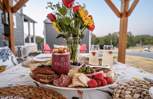 My Songbird is a private corner home with an outdoor covered patio, and two beautiful porches. The white Texas stone masonry firmly adjoins the accent of the home to the region. While the front porch is inviting curbside, the rear covered porch offers privacy overlooking the hill country making it the perfect spot to relax at the end of a great day at Firefly Resort. This unit sleeps 8 comfortably with double loft accommodations for four. The downstairs offers a queen size bed for two in the master bedroom, a twin bed in the spare room, and a pull out sofa sleeper in the living room. The property also provides one full bath with shower and a one half bath for extra convenience. Come listen to the musical sounds of Luckenbach resonate the air around My Songbird… a nod to Fleetwood Mac.