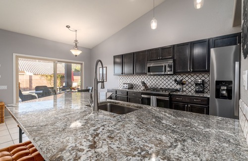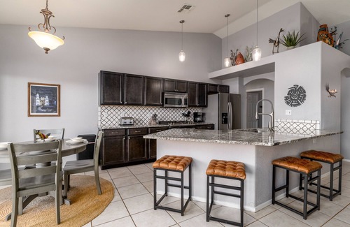 Welcome to Mystic Mountain, your home away from home! See more details using the photo expand button in the lower left corner of the featured picture. Our professionally decorated home features beautiful, comfortable furnishings, flat screen tvs with over 100 channels, a kitchen stocked with everything you'll need, wonderful pillowtop mattresses with premium sheets and bedding. Step outside and enjoy the covered patio, pool with built-in spa or relax on chaise lounges on the cool decking patio. You can even elect to heat the pool (extra fee - $400.00 per week). Soak up the Arizona sunshine, or raise the umbrella and nap in the shade. Watch the colorful sunsets as you bar-b-que on the gas grill, or simply relax with a glass of wine . You may not want to leave the house and back yard! Please take a look at our other home - Property ID 7936573 located in the same neighborhood.