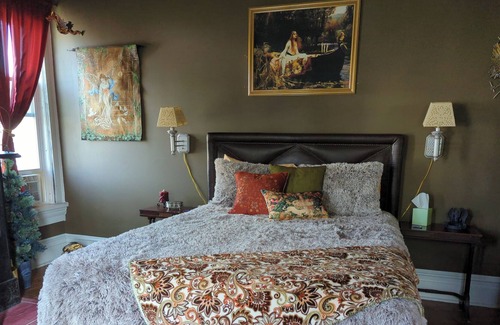 The Mystic Rose Room is reminiscent of a Medieval castle and features a cozy full size bed, a comfortable seating area and a bathroom with a tub / shower combination adjacent to your room.