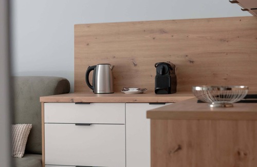 Kitchen and tableware set, fridge with freezer, dishwasher, tea and coffee making facilities, coffee maker