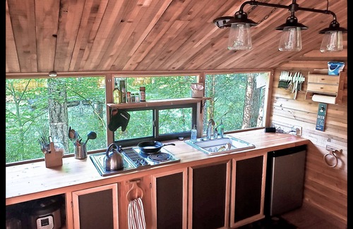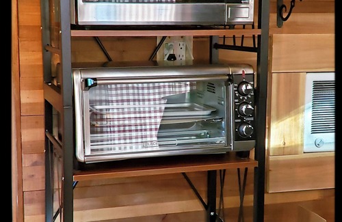 The main cabin kitchen comes with a stove top, microwave, toaster oven, coffeemaker, instantpot, blender, mini-fridge, utensils, dishes, and various other items needed for cooking. If you need to know if a specific item is supplied please do not hesitate to ask.