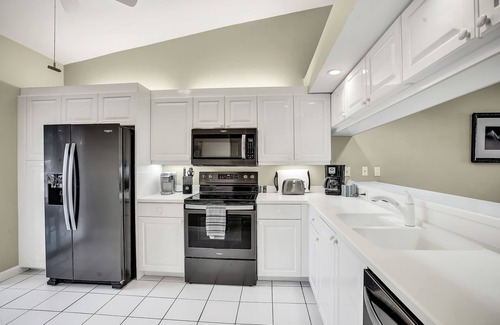 Condo decor includes a new 65 inch flat screen television in the living room. The master bedroom has a king size bed, another flat screen television, and a large walk-in closet, and sliding-glass doors to the screened lanai overlooking the pond. The master bath includes both a ceramic tiled walk-in shower and bathtub. The guest bedroom has a queen size bed and a large flat screen television. The second bath has a bathtub/shower combination. There is a full laundry room with washer and dryer. The kitchen has newer black, stainless appliances and is well- equipped with dishes and cookware. There is a private carport for your your car in front of the condo as well as nearby guest parking spaces.
