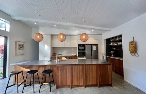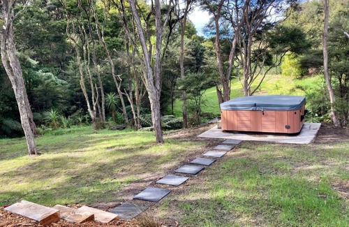 Enjoy a relaxing spa in the kanuka grove, or sip a wine from the portico while listening to the nearby stream and native birds. Nice and handy to the village and beach but feels like your miles away! Beautiful modern home in a private bush setting. 4 bedrooms, two bathrooms, an outdoor spa and an outdoor shower. Excellent portico setup with an outdoor fire which contains a oven accessory. Well set-up for kids with a nice lawn, large trampoline, playhouse and huge jungle gym. They might also like to feed our pet eels in the stream. Well-equipped laundry. Master bedroom contains a lovely relaxing window seat if you need to escape for some quiet time from the rest of the family.