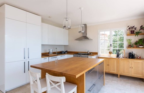 Our house is situated on 2 floors. You enter into the top floor where there is a very well equipped kitchen diner and a large separate living room with a fire place. Both the kitchen and living room opens onto the terrace where there is a large dinning table and a shaded cozy area and a gas barbeque. There are 2 bedrooms and a bathroom on this level. One of the bedrooms has a double bed and the other has 2 singles.