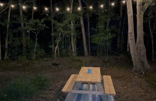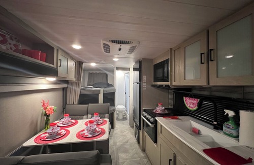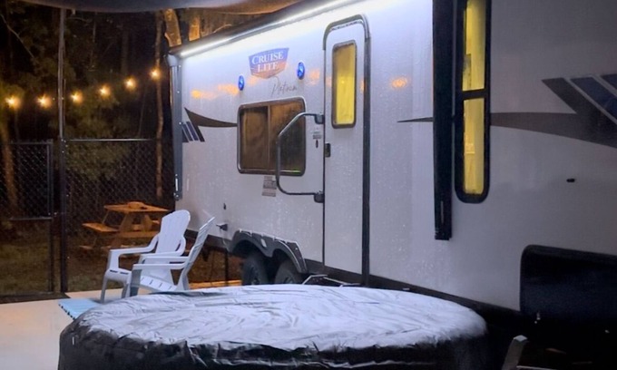 Mins. from major theme parks, airports & less than 10min from UCF. Come stay in our 2bedroom, 3beds, full kitchen & bathroom RV! Surrounded by different trees, plants, butterflies, birds & other wild life. Enjoy the lovely setting of this romantic spot in nature. 4person hot tub with awning under the stars & lit forest . Picnic table, games & fire pit. So much to do & explore. Glamping, Camping, Nature Vibes or Just A Quick Stay!