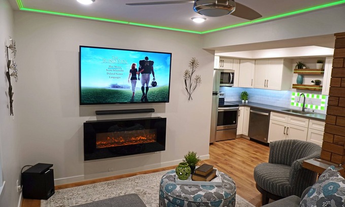 A modern living room with a 60” smart TV, electric fireplace with heater, queen-sizesleeper couch, and one-of-a-kinddesigner LED ceiling lights!