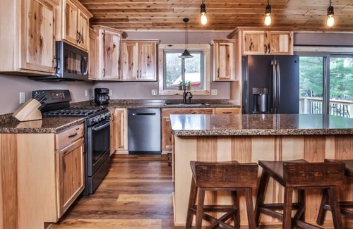 We hope you enjoy the wilderness décor throughout the home. The natural hickory cabinets and cedar plank ceilings provide a warmth for that up-north feel you desire to escape to. Winter vacationers will appreciate curling up in front of the gas fireplace with a warm blanket and a cup of hot chocolate. The swivel chairs are a perfect spot to sit by the large window overlooking the lake: it truly is a beautiful view!