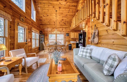 You will enter the cabin through the side door directly into the open living/kitchen area with a vaulted ceiling and large windows for natural light.