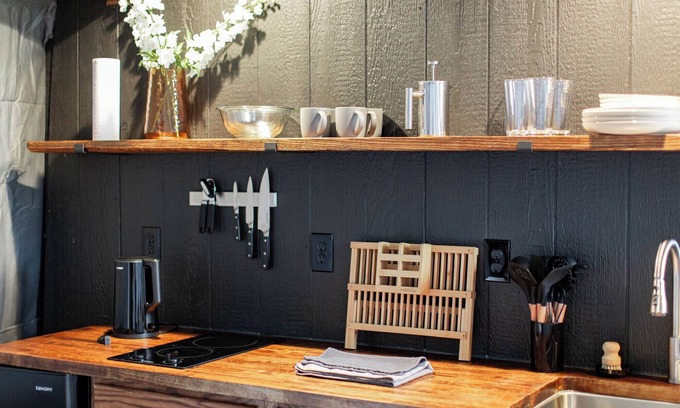 • Kitchen ft. cooktop, sink, mini-fridge,