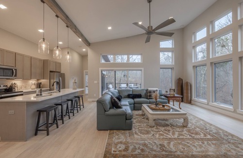 Modern furnishings make for a comfortable stay! Kick back on a plush sectional in the light-filled living area or unleash your inner chef in the open kitchen, equipped with a full suite of stainless steel appliances. The cabinets are stocked with everything you need for complete meal preparation during your stay. When it’s time to eat, gather around the 7-person dining table to enjoy a festive meal with your favorite people!