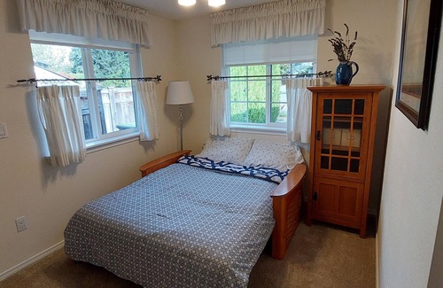 You have your own guest house space with two private entrances and on premise parking. The backyard is shared. You have your own washer dryer in the shared hallway leading to the garage.