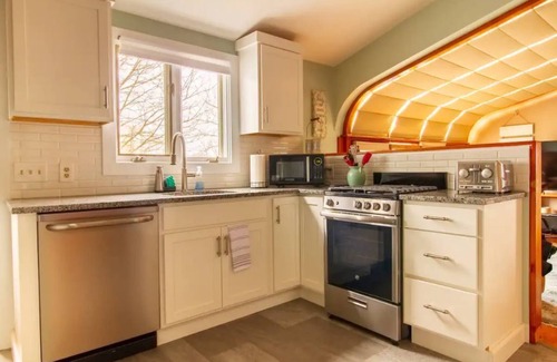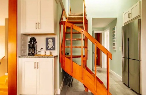 Nautical/beach feel throughout entire dwelling. Each room is cleverly designed - creating a fun escape/adventure for your much needed getaway! Port hole window overlooking Bristol downtown/harbor. Deck with ocean view ~ sailor's delight in this authentic Bristol getaway. Living room boasts a 55" 4K tv for your entertainment pleasure.