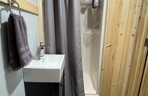Cabin #3 is completely new including knotty pine walls and trim, windows, black out cellular blinds, carpet, bedding, new appliances, plumbing and bathroom. Our cabins are highly insulated for a quiet, comfortable stay, and have city water and sewer which is very hard to find in the UP. In addition, we saved the original porcelain farm sink from 1953, which is in great shape and helps provide a rustic, yet modern feel.
