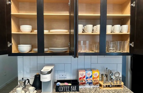Just steps away, the fully equipped kitchen is a culinary haven, featuring standard appliances, generous prep space on the island countertop, and all the essential cookware, bakeware, dishware, flatware, glassware, serving-ware, and utensils. The double sinks in the island streamline cleanup, and your morning coffee awaits at the Keurig coffeemaker in the coffee station, equipped with all the tools for crafting delightful beverages.