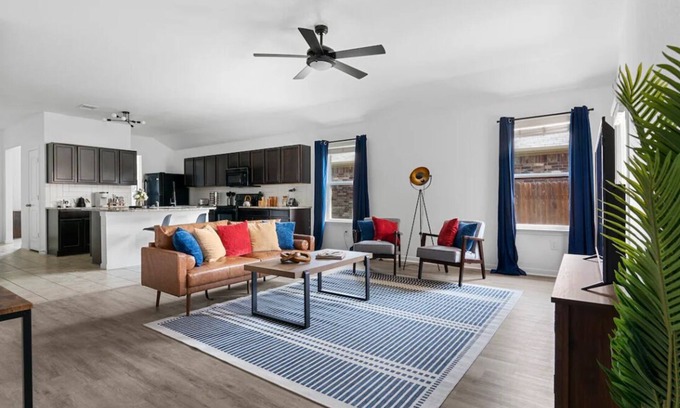 Settling in Austin due to insurance relocation, as a long-term contract worker, or in need of corporate housing? Our pet-friendly rental is designed to ease your stay. Enjoy a dedicated workstation, high-speed AT&T fiber-optic Wi-Fi, and a fenced yard—perfect for your family and pets. The relaxing patio with a grill adds to the comfort. A fully equipped kitchen and a spacious king suite ensure your comfort during your extended stay.