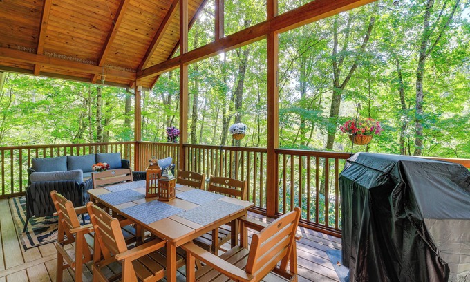 This custom built cabin is the perfect spot for fun and relaxation. Located on the borders of NC, TN, and VA, this vacation rental puts you close to several mountain towns. Enjoy hiking, water activities, golfing, biking, skiing, and so much more. Then, gather for an al fresco feast, an evening by the fire, or a dip in the hot tub. You'll love the high-end comforts and scenery!