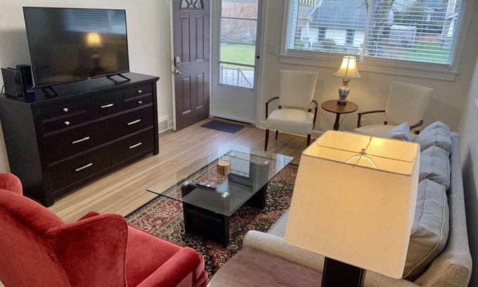 Comfy 3 bedroom home has 2 queen and 2 twin beds. Hardwood floors throughout. Free WiFi, 55" flat screen Smart TV in Living Room, fully stocked Kitchen. All amenities including Washer, Dryer, Dishwasher and Microwave. Coffees, Teas, filtered Water and Snacks provided. All upholstery, bedding, towels and linens are provided.