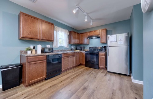 Guests will enter through the front door using a digital keypad. Once inside, you will find an open-concept living room, kitchen, and dining room on the main floor. The living room has a sofa, a futon, and a large SmartTV. The kitchen has all the essential cookware and dinnerware, and there are two dining tables for meal times.