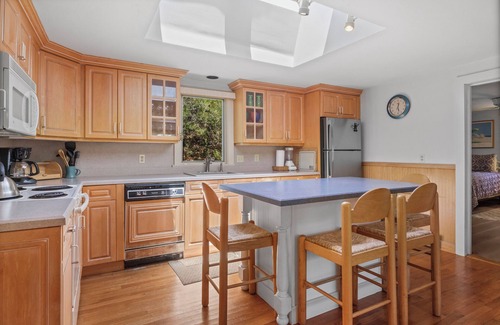 The house features a cozy living room with Roku TV and a DVD player. The updated kitchen with adjoining dining area also serves as additional living space with a spacious dining room table perfect for night time board games. The kitchen is fully equipped and has a nice island with bar stool seating. The first floor has two bedrooms, one with twin beds, the other with a queen. The first floor bathroom was recently fully renovated