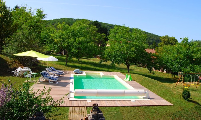 Magnificent swimming pool in the height of the ground with solar shutter, deckchairs & mattresses, exotic wooden terrace, 2 parasols, small and big living room of garden, charcoal barbecue, swing. Unobstructed view of the Céou Valley and its hot air balloons. Garden with trees and flowers.