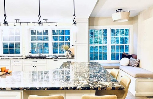 The centerpiece of the house is a wonderfully designed kitchen with walls full of windows looking out on Pine Creek. A spacious kitchen island (with stools for dining) and a luxurious window seat, make this the perfect spot for relaxing, with room for the whole group to be part of the cooking experience. An adjacent dining area with French doors opening to the outdoor patio provides a great space for meals and celebrations, and a perfect transition between the indoor and outdoor spaces.