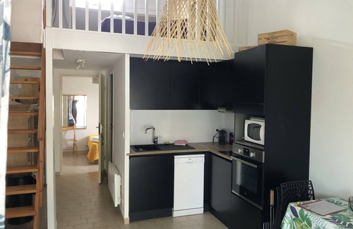 This rental includes a living area with kitchen area (dishwasher, coffee maker, toaster, kitchen utensils, frying pans, pots etc.), a bathroom with shower and toilet and washing machine, a bedroom on the ground floor. ground floor with 2 80 cm beds and a large fitted cupboard, a large 15m2 mezzanine with Velux window (blackout blind) and its 160 cm x 200 cm bed,