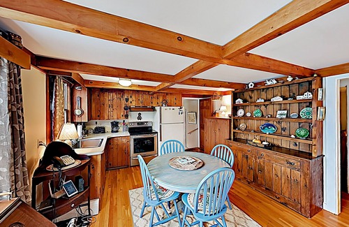 KITCHEN & DINING Whip up hearty meals in the well-equipped kitchen. When your culinary creations are complete, dine together at the wooden table set for four.