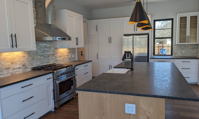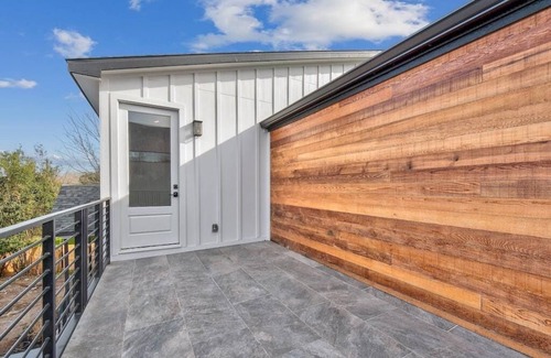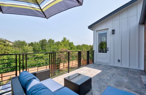 This new construction, $2,500,000 home was completed in February and we are renting it on VRBO until the realty market improves for expensive home sales. It rests on a large lot in a quiet, gentrified south Austin neighborhood. 10 minutes from Zilker Park and Barton Springs! Great living spaces, multiple covered patios, gourmet kitchen, outdoor gas BBQ, heated 14'x22' pool, 3000 sqft floorspace. Giant soaker tubs in each of the two master suites with private patios, one upstairs and one on ground floor. Separate upstairs & downstairs living areas with 55" TVs for adults/kids. 3 Bedroom TVs. Fenced front & back yards, suitable for pets or kids. House backs to greenspace creek for privacy and birdwatching. Come and enjoy!