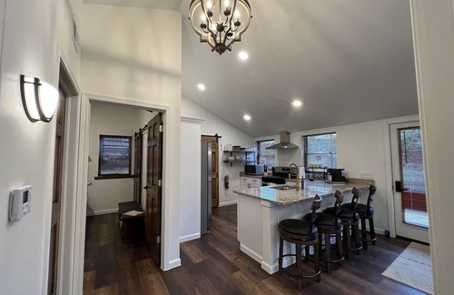Newly renovated 2BR 1Bath Home w/ vaulted & cathedral ceilings, composite side deck on a Beautiful Creek! Located at Oil Creek State Park entrance, providing cross-country skiing, biking, fishing, hiking, hunting, and more! Imagine, relaxing around the crackling fire by the the creek. Property has covered parking, a huge outdoor boulder landscaped FirePit, E-Bikes & more! ( jump on the bikes and head to the park, which is just down over the hill, then take the Samuel T justice bike trail, 9.2 miles to Titusville for lunch/ dinner & If you don’t feel like peddling back, just push the button and the Bikes will take you home just in time to jump in the hot tub!)