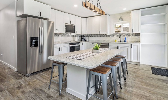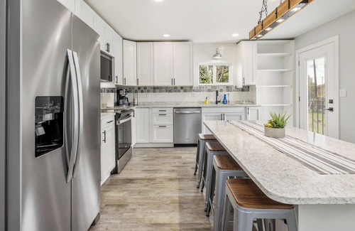 This superb, newly renovated, property boasts 3 bedrooms - one with a king bed, one with a queen bed, and a third with a cozy queen over twin XL bed. With 2 bathrooms and essential amenities like WiFi, laundry, AC, and large app enabled TV, guests will feel right at home. Or if you please, go outside and enjoy a swing on the porch or lay in the hammock. Better yet, eat with your family outside on the picnic table! Our place is equipped for both long or short stays to make your stay one to remember.